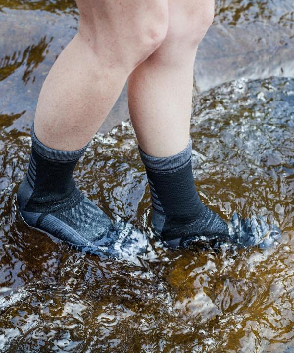 A supple outer and liner with wicking cushioning across the entire footbed makes these midweight socks great for fast-paced adventure, sports, and wet-weather workouts.